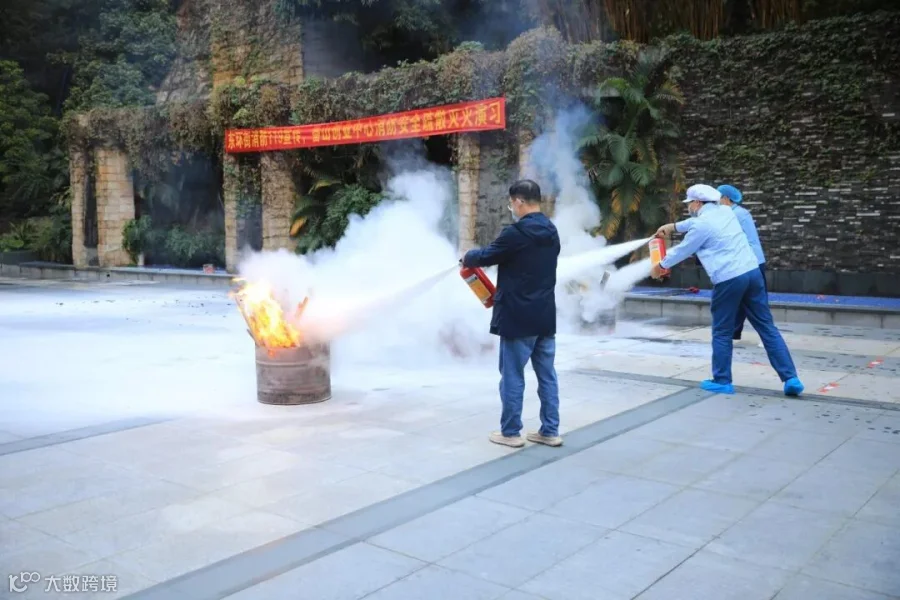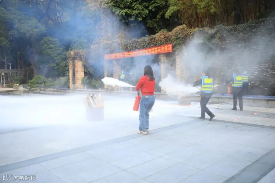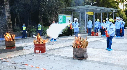 技能展示结束后,物业服务中心组织企业员工进行实操,使用灭火器将铁桶中的大火扑灭,确保企业员工都能够熟练掌握灭火技巧。