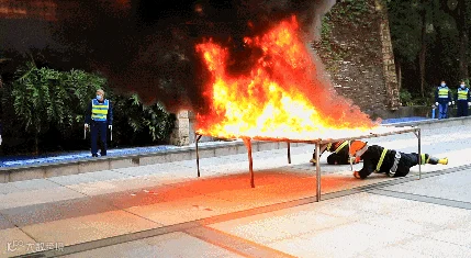 之后进行消防技能展示,园区消防安全员迅速穿戴防火服、防毒面具,匍匐穿越火网,充分展现园区应对突发事件的防范能力,现场赢得一片掌声。