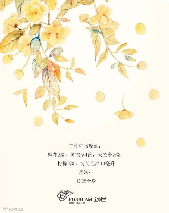 1、工作学习上的压力我会推荐橙花和橙叶,将精油调在花水中敷脸或当成喷剂随时喷。或用下面配方涂抹身体或香薰。