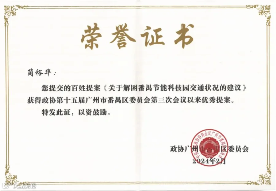 番禺区新联会番山ABP园区分会理事、中共番山创业中心园区党支部书记简裕华提交的《关于解困番禺节能科技园交通状况的建议》获评优秀提案;