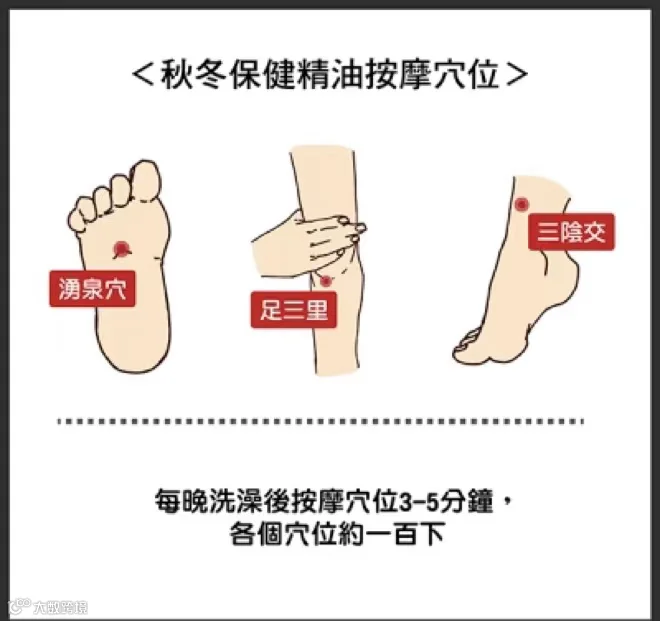 3. 睡前用精油按摩下面三个穴位,各一百下。