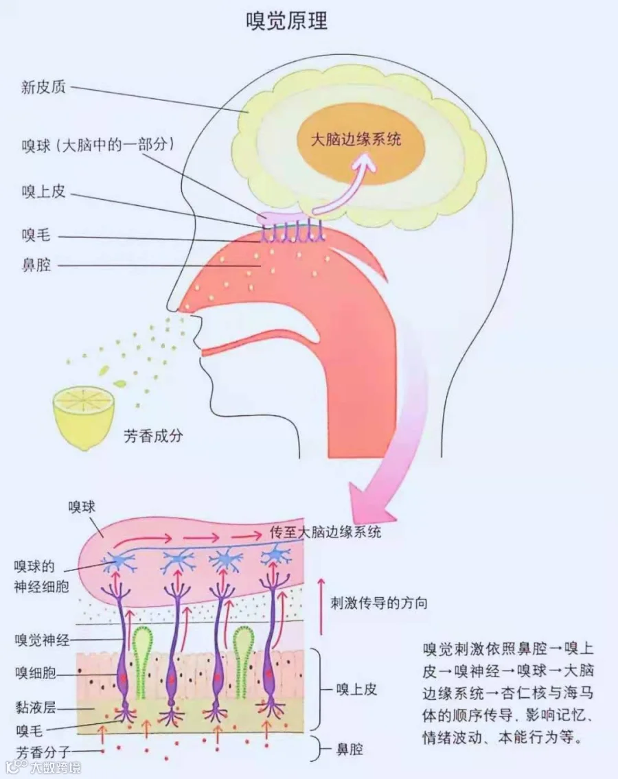 嗅觉系统,是芳香疗法与其他自然疗法的区别之处。嗅觉路径,是精油进入人体的重要通路,嗅觉,也是人体唯一一个和大脑边缘系统直接关联的感觉器官。