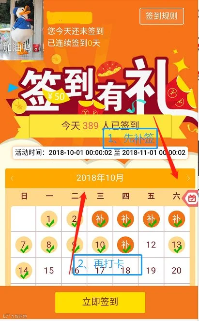 (2)如果您是在最后一天需要补签和签到两样同时进行,请“务必”一定记得先补签再正常打卡,这样系统才会判定连续签到,如果您签反了导致连续签到判定失败,则视为自动放弃礼品。10月起不再进行人工核实服务哦~