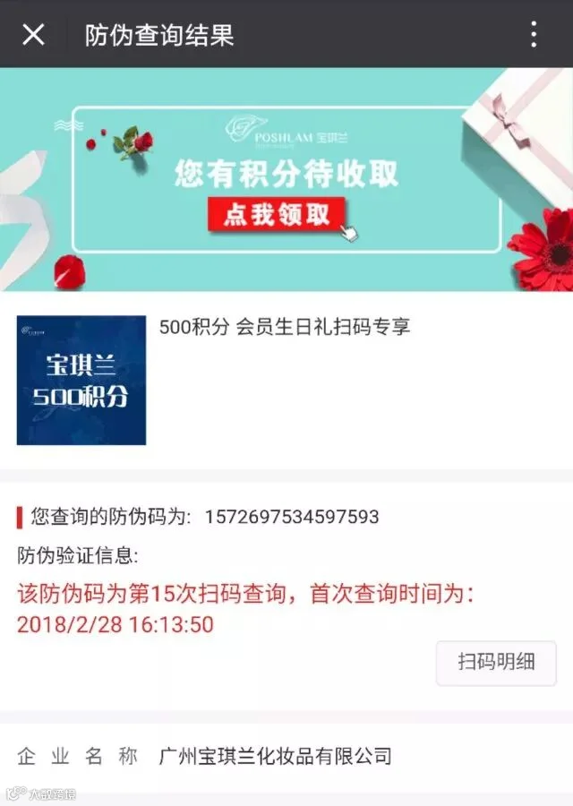 以上图为例,当你拿到全新宝琪兰产品以后,千万不要着急拆包装,记得将查看产品塑封封口处的二维码标贴,刮开涂层后,使用微信扫码,即可跳转至如图所示页面。(商品仅为测试)