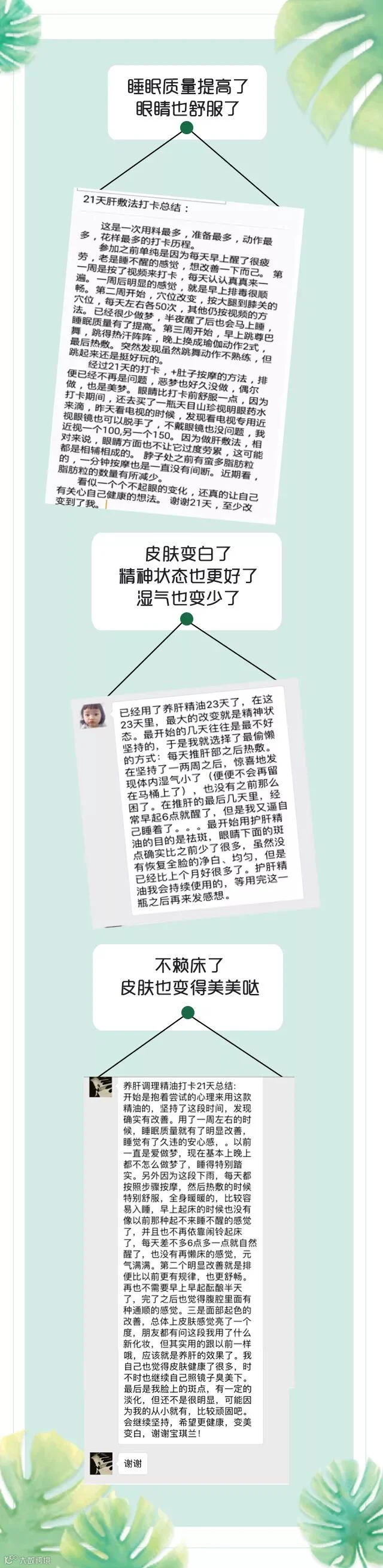 “养肝护胆打卡”本身是为了帮助祛痘淡斑的顾客而定,结果告诉我还具有眼睛明亮、肠胃变好、睡眠质量提升、改善身体疲乏、不赖床等等功效。