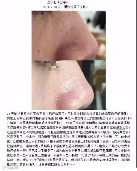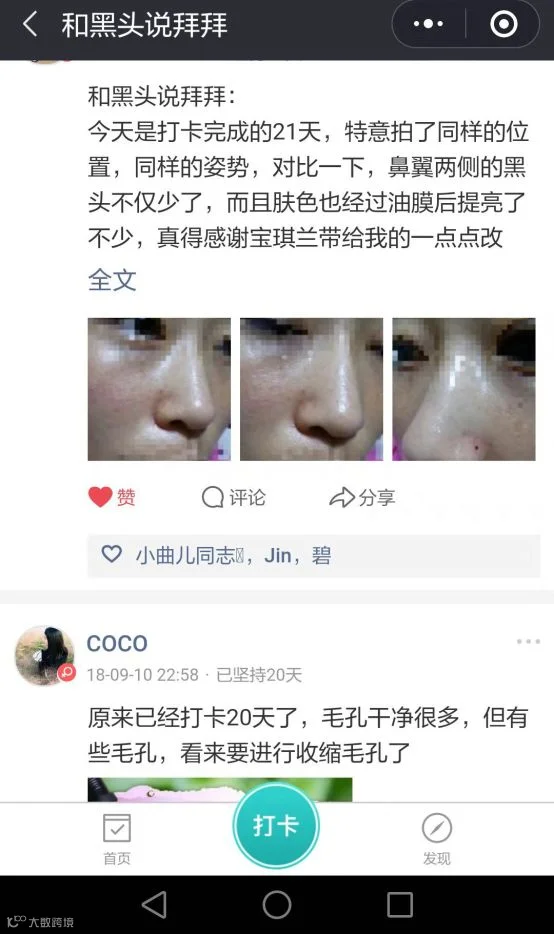 这是第二期的21天黑头打卡护肤活动,从8月20号到9月7号,群里面的小伙伴们可谓是非常积极,纷纷晒出了自己每一天祛除黑头后的肌肤状况, 21天后,小伙伴们都讶异自己皮肤的改善,科学护肤+日复一日的坚持是皮肤变美的关键。