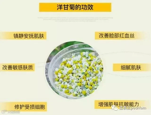 洋甘菊可改善过敏的皮肤,几乎市面上所有的敏感护肤产品都添加了它,其温和的特性也是婴幼儿产品的首选。还能舒解眼睛疲劳,将冲泡过的冷茶包敷眼睛,更可以帮助去除黑眼圈。洋甘菊消炎去火,另外解痉挛,抗腹胀和舒缓的作用。对肌肉酸痛以及偏头痛,且对胃及腹部神经有所助益。