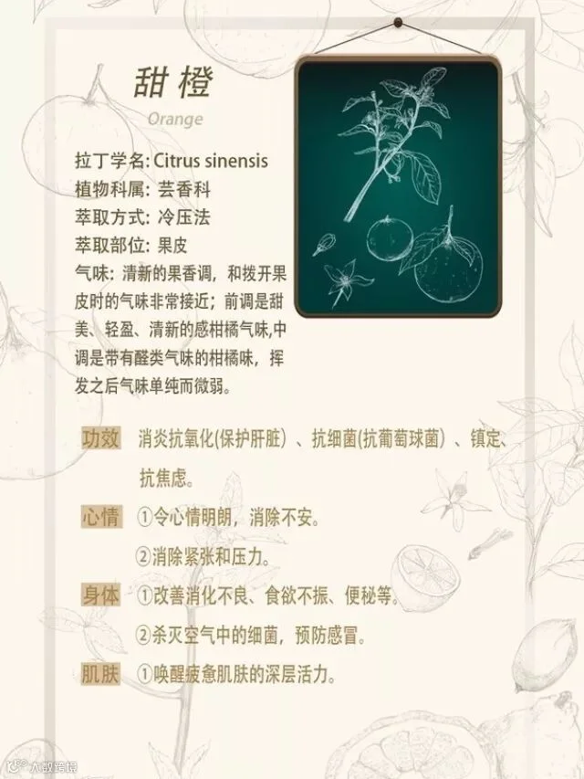 甜橙:甜橙馥郁饱满的香气,不禁让人联想到一颗充满活力又明亮的太阳,它会慢慢得侵入你的身体,瞬间就能感受到轻松和舒缓。