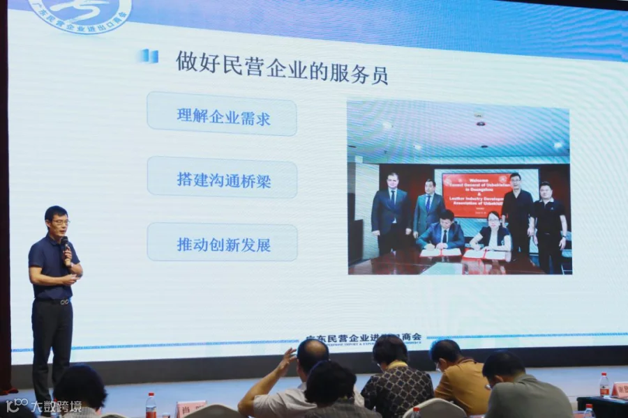 广东民营企业进出口商会会长高飞以《诚信领航,赋能粤企链接全球经贸》为主题,分享了粤企在全球贸易中的机遇与挑战,以及如何通过诚信经营,利用商会资源和服务矩阵,助力粤企在RCEP及“一带一路”等国际市场取得成功。