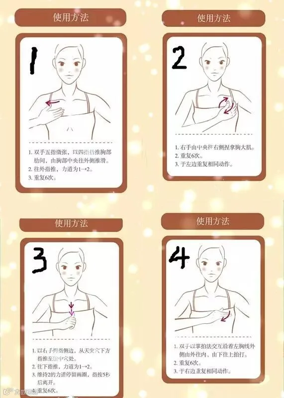 洗澡后用胸部精油涂于乳房,以乳头为中心点,用拇指交替从乳房周围向乳头方向按摩一圈,再重点拇指交替按摩乳房结节的地方,针对性改善,并注意在结束按摩的最后几次,手部应划向腋窝位,以帮助带走淋巴积液。每周可做2-3次, (按摩时间5-10分钟即可)。按摩手法请看下图。