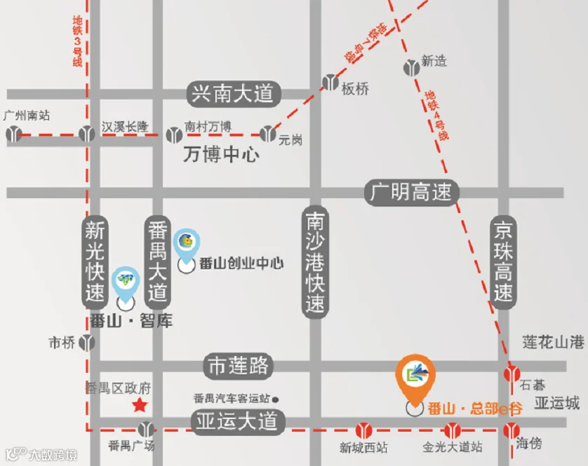 位于亚运大道黄金地段,番禺区“四区一轴”战略发展规划的核心位置的番山总部E谷园区是亚运大道上的绿色智慧总部群,南侧临近亚运大道(清河东路),北侧为规划路,附近广澳高速、南沙港快线,广州地铁三号线、四号线,莲花山港等。