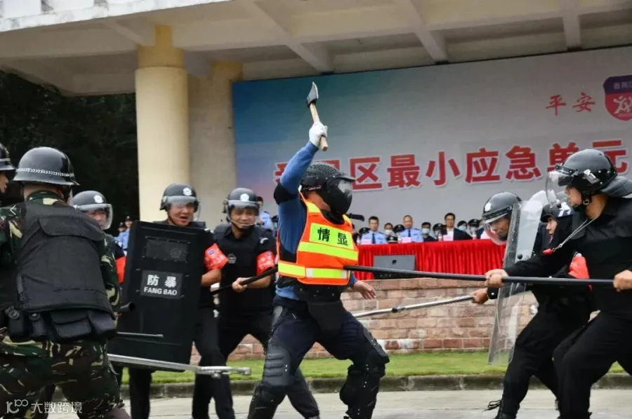活动中,分别进行了最小应急单元个人技能挑战赛展演、模拟场景对抗演练,并进行了广州南站应急分队棍术展演和番禺区公安分局机动大队特警战术展演,集中向出席的领导嘉宾以及全区240个应急单元代表、300名村居治安联防队员展示了优秀的处突技能水准。