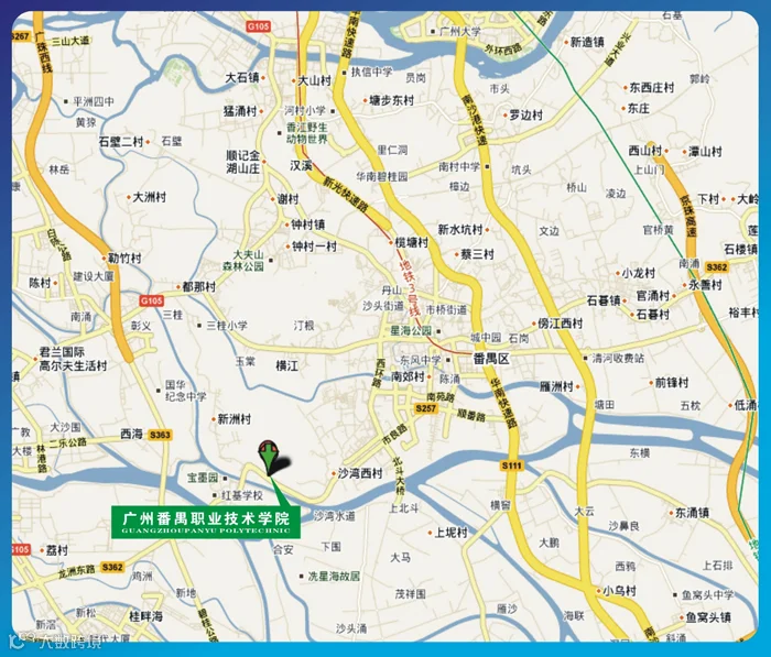 (二)番禺市良路路线:沿顺德大良/宝墨园方向,在靠近龙湾路口的花坛处右转,进入我校西门(后门)(GPS设定终点为广州番禺职业技术学院即可)。