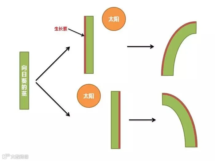 这和一种叫做生长素的植物激素有关。它在植物里能起许多作用,其中包括控制茎的生长速率。然而生长素又有“讨厌阳光”这个特点,它们总是喜欢躲在暗的地方。