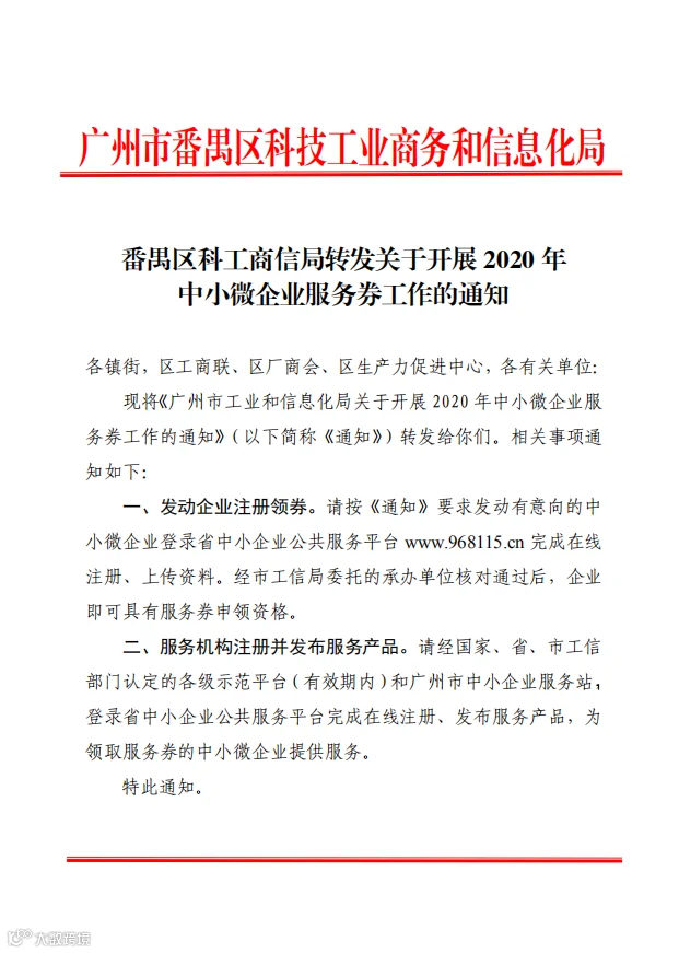 番禺区科工商信局转发关于开展2020年中小微企业服务券工作的通知!