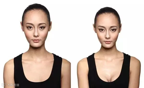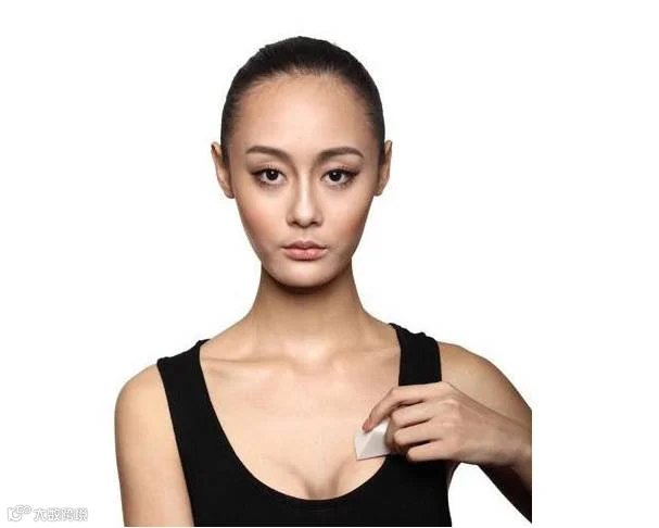 Step1: 对着镜子,先找出自己的胸的位置,在胸沟这个地方,用阴影粉画两个半弧形的胸型。