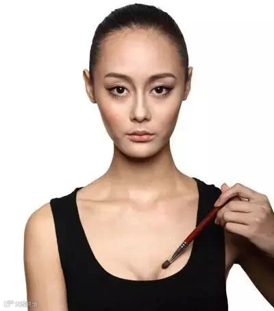 Step2: 用高光亮粉在两个胸部中间刷上提亮粉,可适当根据胸型画一个类似倒三角一样的扇形面积。