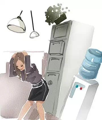 办公室里感到剧烈晃动的话,很可能是地震,用手或靠垫、文件夹护住头部,寻找大型稳定物体附近的“生命三角”躲避。