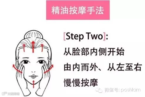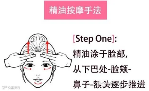 Step 1:将精油涂于脸部,从下巴开始,依次向脸颊、鼻子,额头逐步推进,紧致脸部轮廓。