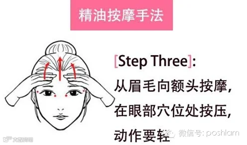 Step 3:从眉毛向额头按摩,并在眼部穴位处轻轻按压,消除眼部肌肤的松弛状况。