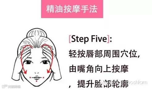 Step 5:用手指指腹轻轻按压唇部周围的穴位,由嘴角向上按摩脸部,消除嘴角纹,并提升脸部的轮廓。