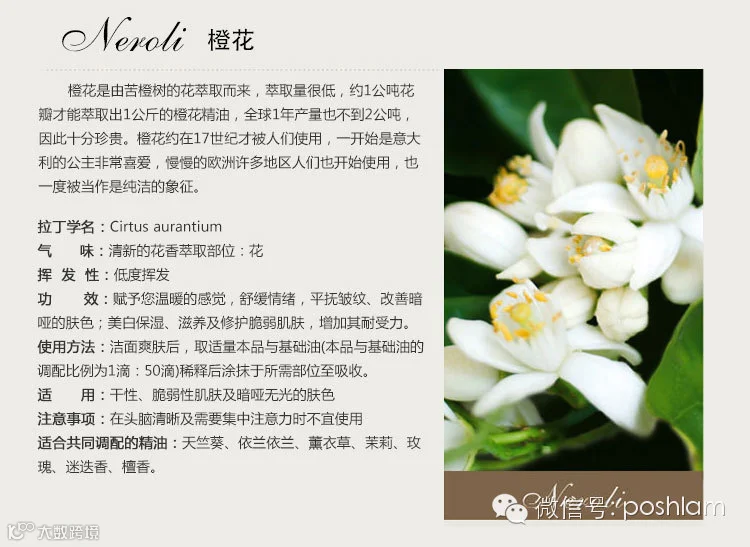 橙花精油4滴+乳香精油4滴+荷荷巴油10ml+玫瑰果油10ml。有助增强肌肤弹性,美白保湿,改善干燥及晦暗肤色,使肌肤细腻紧致。