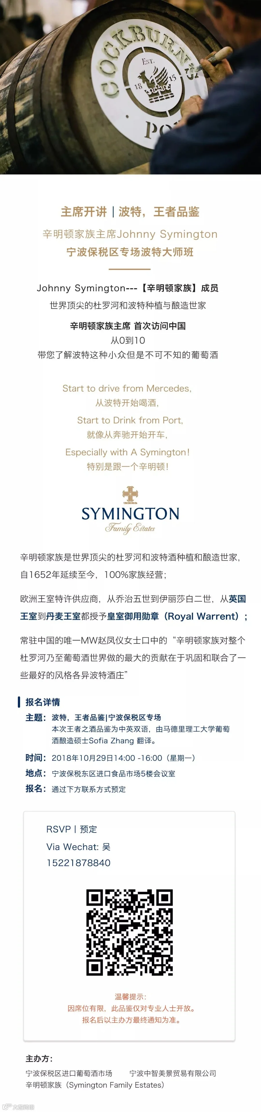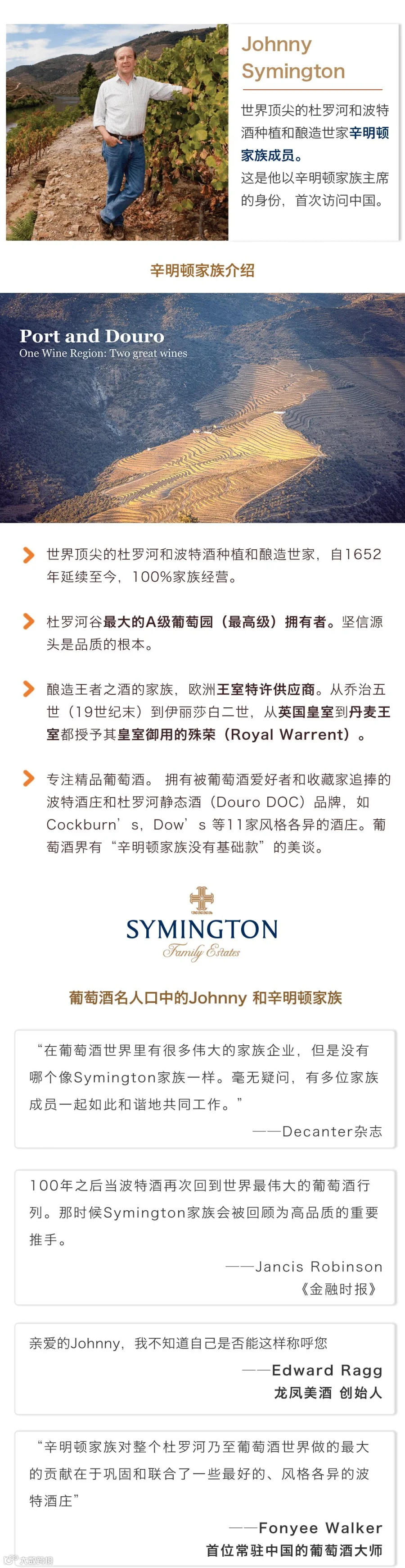 世界顶尖的杜罗河和波特种植与酿酒世家---辛明顿家族主席Johnny Symington首次到访中国,会给我们带来怎样的惊喜呢?