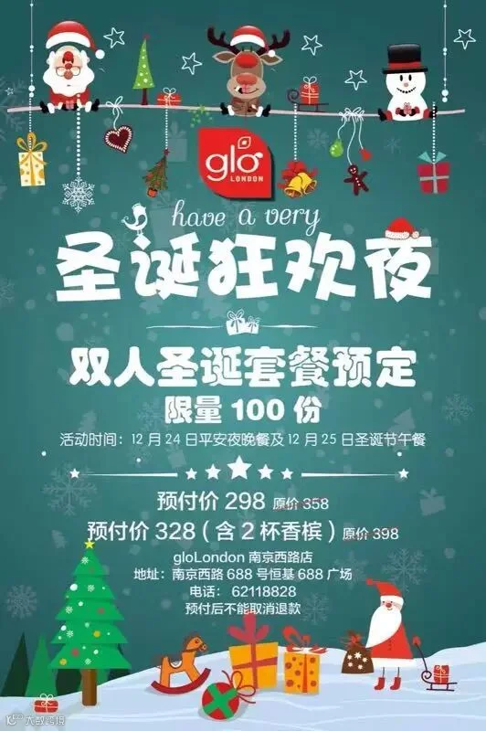 位于南京西路688号L101的Glo London餐厅提供的圣诞大餐,原价398和358的圣诞大餐。