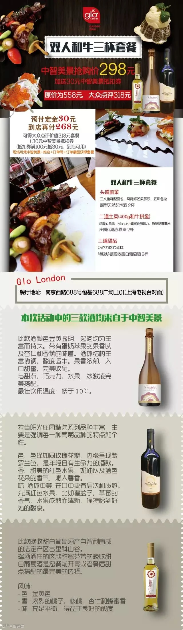 中智美景&GloLondon 线下体验双人和牛豪华套餐本周开始上线。Glo London位于