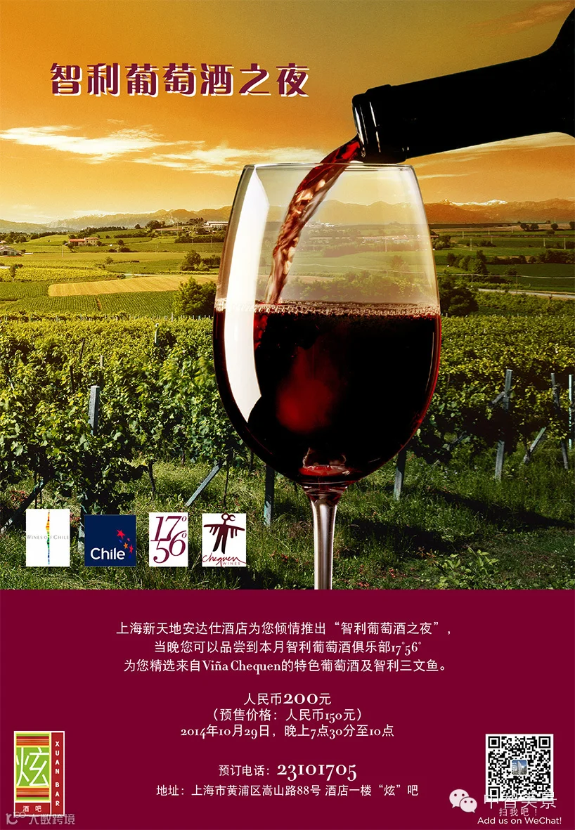 本月29日,中智美景联合智利17°56°葡萄酒俱乐部在上海新天地安达仕酒店倾情推出“智利葡萄酒之夜”——月度酒庄Vina Chequen发布会。当晚您可以品鉴到来自智利奇肯酒庄的特色葡萄酒及智利三文鱼。