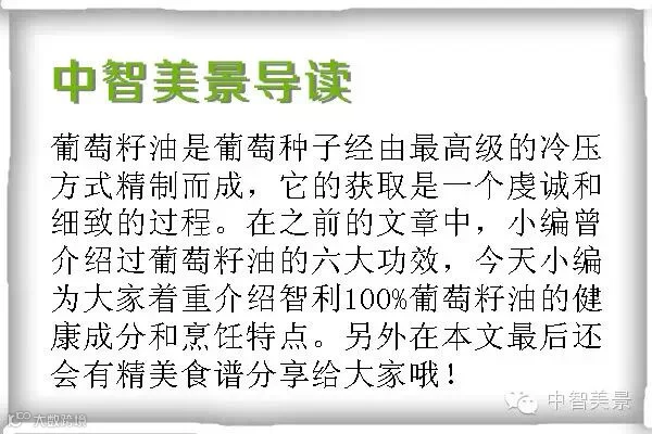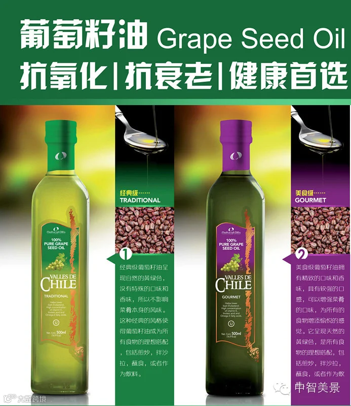 智利山谷系列100%葡萄籽油全部来自于智利中央山谷的优秀葡萄庄园。智利的中央山谷是智利最优秀的葡萄和葡萄酒产区,该产区只精选专门用于酿造高端出口葡萄酒的优质葡萄的籽来精制葡萄籽油。