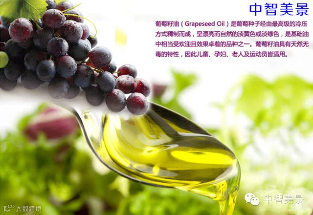 葡萄籽油的健康成分葡萄籽油中有两种非常重要的元素,亚油酸和原花青素。原花青素OPC是目前自然界中发现的抗氧化、清除自由基能力最强的物质,其抗氧化活性为维生素E的50倍、维生素C的20倍,它能预防多种疾病的发生,特别是对心血管疾病非常有效,同时能护理皮肤,预防衰老。