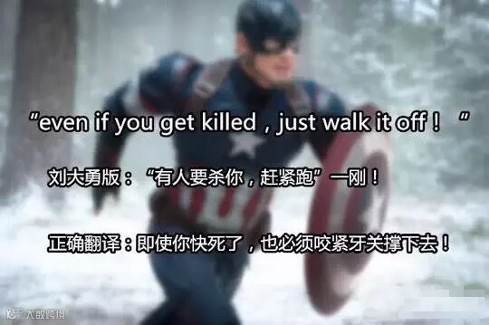 字幕显示:“有人要杀你,赶紧跑”一刚!我差点想一盾牌砸死翻译的人!这是美队的灵魂格言,正确翻译是即使你快死了,也必须咬紧牙关撑下去!跑你全家啊赶紧跑!”