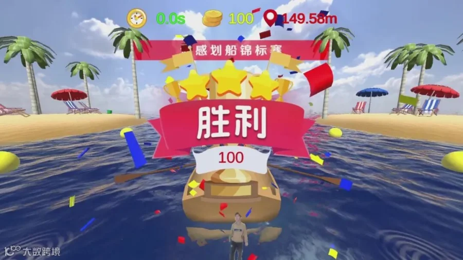 玩家通过“双臂前后滑动”给小船加速,控制前进速度,吃到金币获得积分。