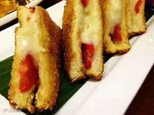 以榴莲果肉混合椰奶、吐司,再淋上椰果肉烤制而成,甜香扑鼻,口感软糯酥脆。