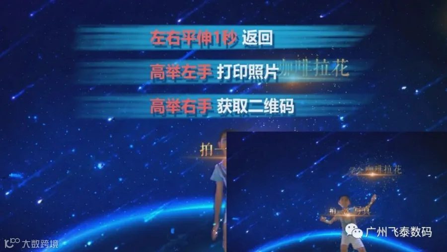 (4)支持手势拍照("双手左右平伸维持1秒"触发拍照),支持二维码获取照片,支持打印照片