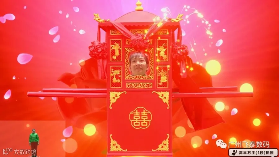 (2)互动画面:玩家人脸实时抠像融合到花轿窗口中,体感摄像头无绿屏实时抠像(AI修复头发抠像缺失)