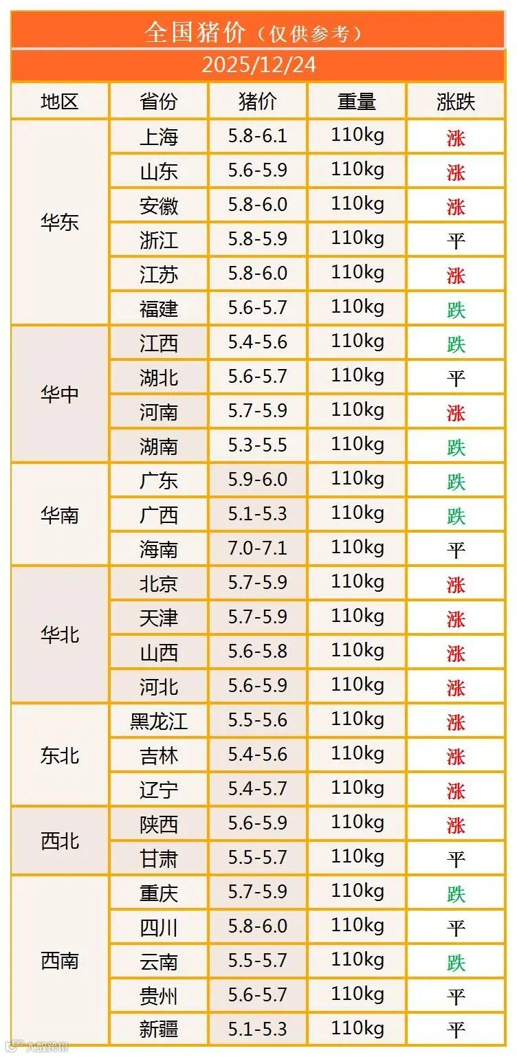 明日猪价2025年12月24日猪价信息
