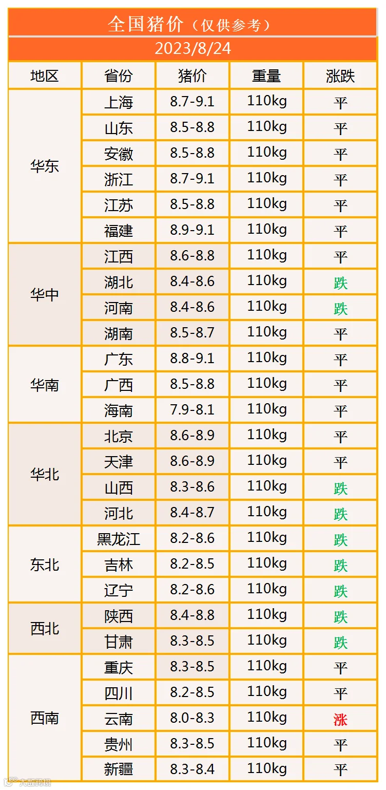 明日猪价2023年8月24日猪价信息