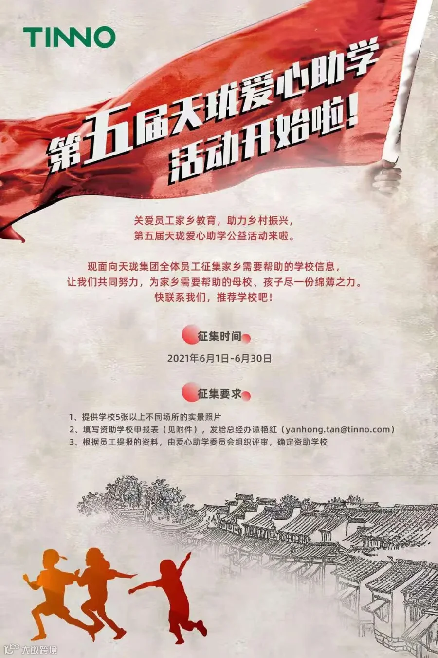 关注员工家乡教育,助力乡村振兴,2021年天珑爱心助学公益活动已启动,现面向天珑集团全体员工,征集家乡需要帮助的学校信息,特别是偏远农村地区的小学,欢迎大家积极提供家乡山村小学需要资助的信息,让我们一起公益作伴,回乡助学,为家乡需要帮助的学校,孩子尽一份绵薄之力。