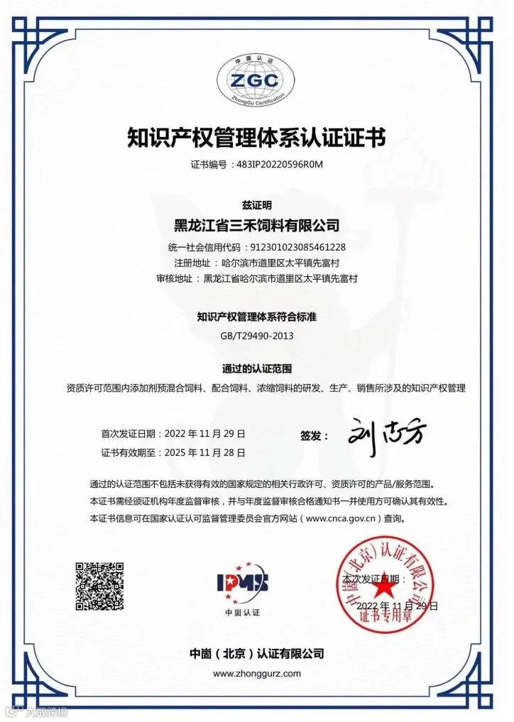 近日,领鲜集团黑龙江省三禾饲料有限公司顺利通过知识产权管理体系认证, 获得《知识产权管理体系认证证书》(证书编号:483IP20220596ROM),认证范围:资质许可范围内添加剂预混合饲料、配合饲料、浓缩饲料的研发、生产、销售所涉及的知识产权管理。这标志着我公司知识产权管理能力得到充分认可。