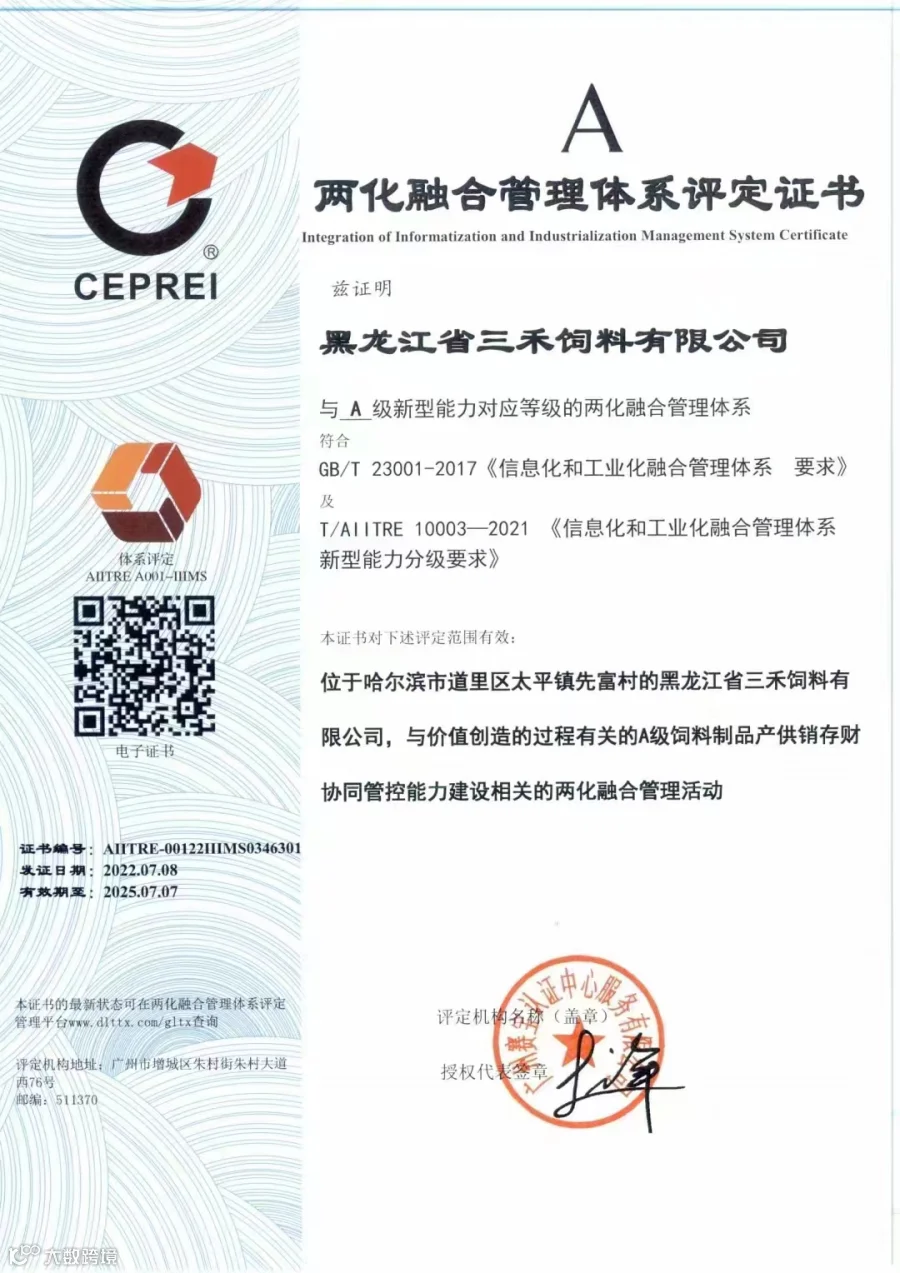 广东领鲜集团黑龙江省三禾饲料有限公司获得“两化融合管理体系评定证书”