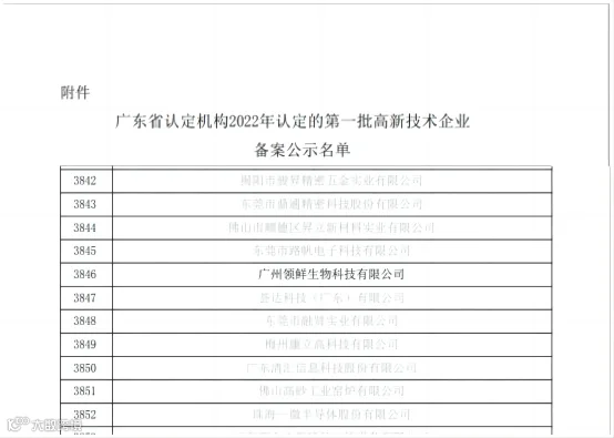 根据《高新技术企业认定管理办法》(国科发火〔2016〕32号)和《高新技术企业认定管理工作指引》(国科发火〔2016〕195号)有关规定,根据全国高新技术企业认定管理工作领导小组办公室公布的《广东省认定机构2022年认定的第一批高新技术企业备案公示名单》, 广州领鲜生物科技有限公司成功进入广东省2022年认定的第一批高新技术企业备案名单,这是我司自2016年起第三次通过国家高新技术企业认定。