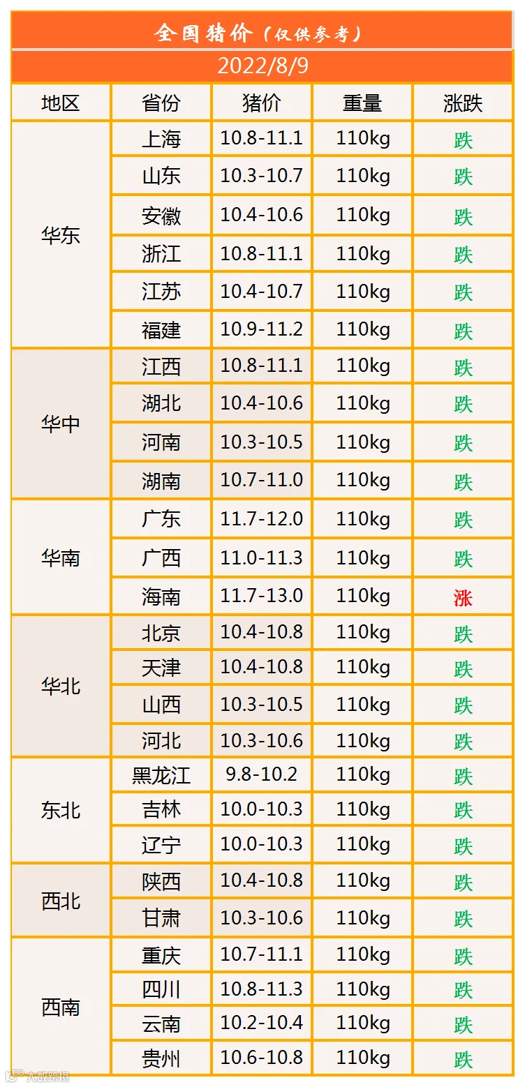 明日猪价2022年8月9日猪价信息