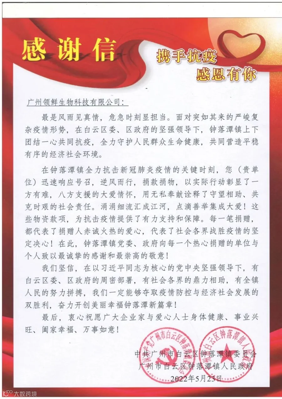 近日,广州领鲜生物科技有限公司收到中共钟落潭镇委员会、钟落潭人民政府发来的感谢信,表扬我公司在为抗击新冠肺炎疫情的关键时刻,响应号召,对大罗村委会抗疫工作进行了款项捐赠。这是继民生建设项目捐赠后再次捐赠,体现我公司热心公益,用无私奉献诠释了共克时艰的社会责任。