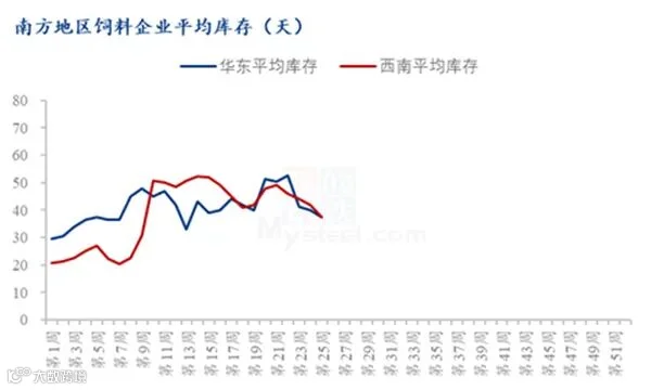 截止到2022年第25周,西南地区饲料企业平均玉米库存天数为38天,周环比下降9.52%;华东地区饲料企业平均玉米库存天数为38天,周环比下降5%。
