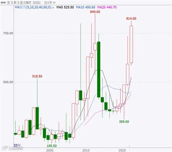 纵观美国玉米33年走势来看,最近美玉米期货价格逼近历史高点,一度升至近10年高点8.14美元,与年初相比,今年玉米期货价格已上涨超过33%。从长期来看,全球对于种植的担忧已经逐步体现到期货市场,玉米后期进口成本必然跟着上涨。