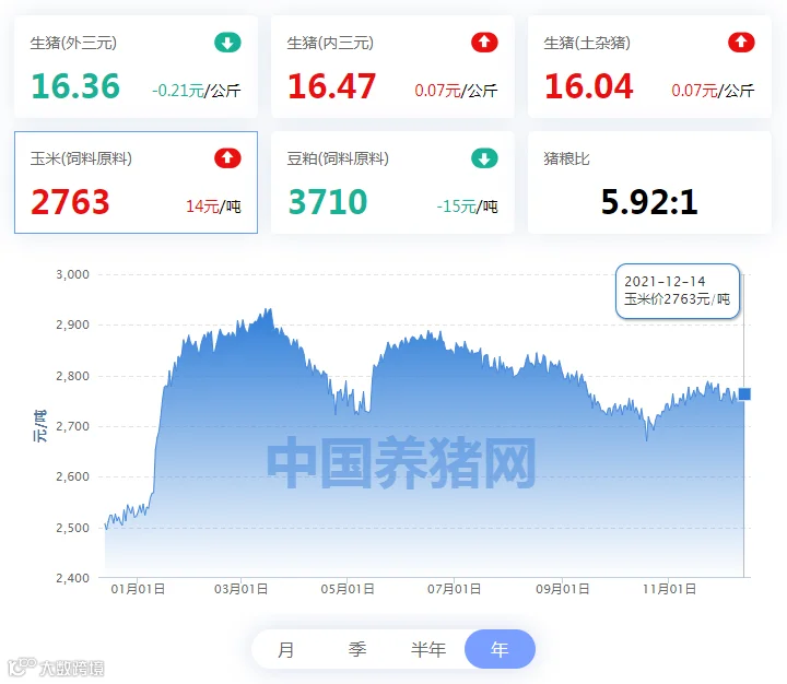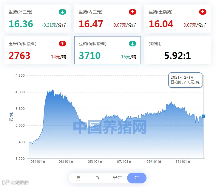 | 地区名称 | 外三元(元/公斤) | 内三元(元/公斤) | 土杂猪(元/公斤) | 玉米(元/吨) | 豆粕(元/吨) |