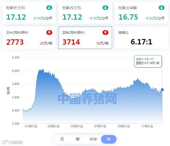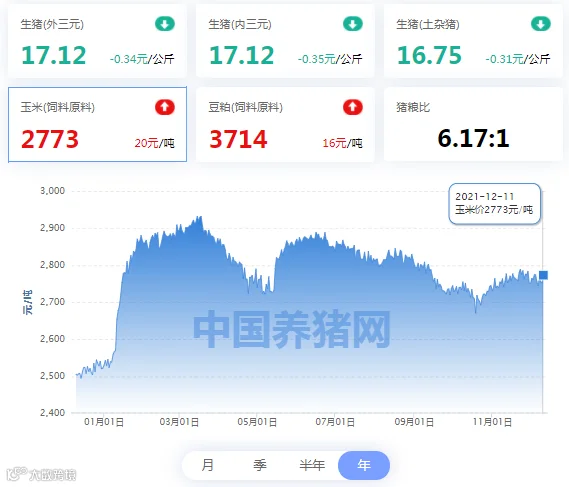 | 地区名称 | 外三元(元/公斤) | 内三元(元/公斤) | 土杂猪(元/公斤) | 玉米(元/吨) | 豆粕(元/吨) |