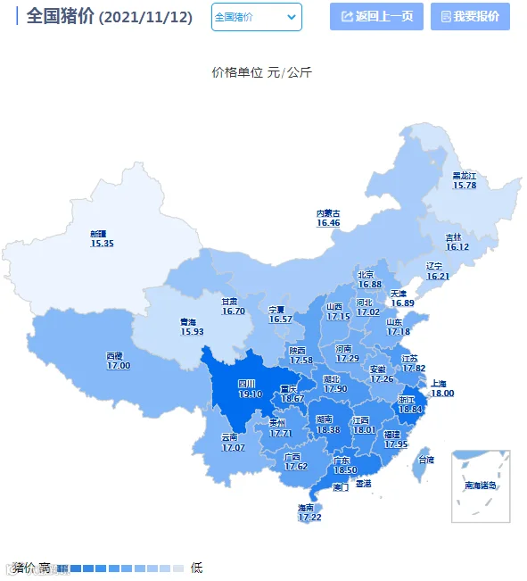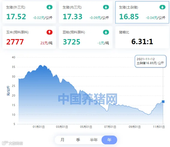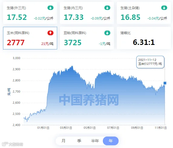 2021年11月12日(星期五),中国养猪网“养猪数据中心”监测的生猪价格以及饲料原料价格明细如下:
